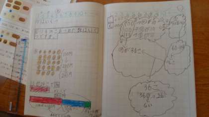 考え方を書くときに,10円玉を書く子,丸を書く子,テープ図を書く子・・・いろいろな考えがでてきました。