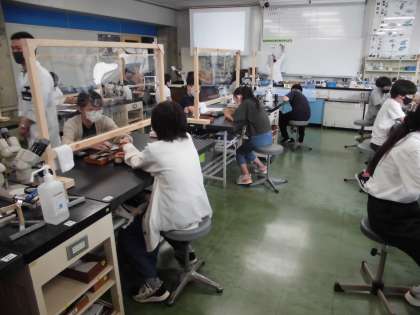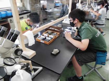 科学センターへ学習に行ってきました。地学を選択した子どもは,「石の中からキラキラゲット」の学習をしました。まずは,いろいろな石をじっくり観察したり,砕いた石にライトを当て,ルーペで細かく観察したりしました。