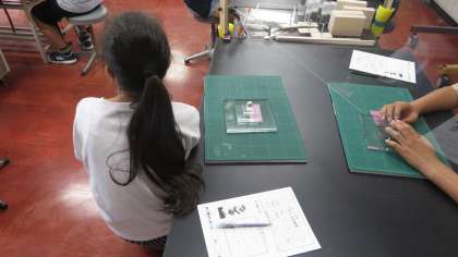 5つのガラス板を重ねて,安定するかどうかや揺らせばどうなるか確かめています。