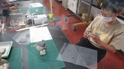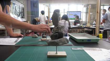 木の板にねじが埋め込まれたものの上に石をつんでいきます。