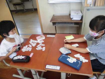 「たしざん」の時と同様に,「ひきざん」でもカードを使って友達と問題を出し合って練習しています。たしざんに比べると難しく,数図ブロックを動かしたり,指を折ったりして考えている姿が見られます。練習を重ね,少しずつ答えるスピードが速くなっていくといいですね。