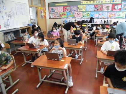 今日は,たくさんのお家の方が来てくださって,子どもたちの学習をサポートしてくださいました。初めてタブレットにログインをし,ロイロノートを開いて,北白川スポーツの写真を見ました。キーボードの入力に苦戦していましたが,写真が先生から送られてくる度に,「わぁ!なんか届いた!やったー!」「タブレットってすごいな!」と歓声が上がっていました。少しずつ,使い方に慣れていきたいと思います。