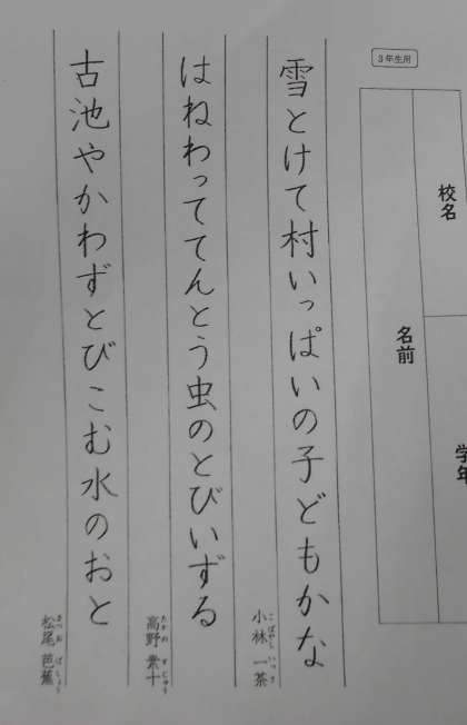 今日は,毛筆ではなく,鉛筆を使って3つの俳句を書きました。