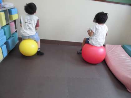 音楽に合わせて,バランスボールでリズムをとったり,打楽器をならしたりして