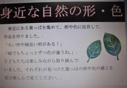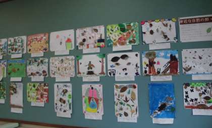 運動場で集めた植物の葉などを並べ,そこからイメージしたものを絵に表しました。