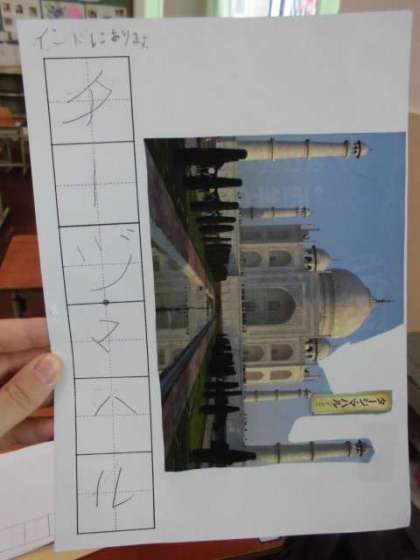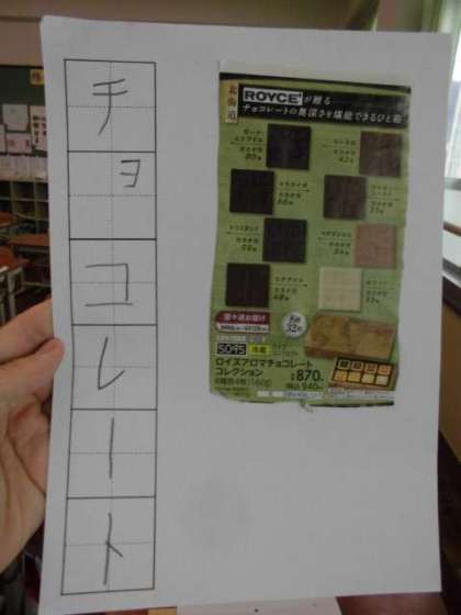 「かたかなをみつけよう」では,お家から持ってきたチラシやパンフレットからカタカナを見つけ,用紙にうつしました。「スーパーのチラシにいっぱい載っていたよ。」「かたかな見つけ,面白いな!」と楽しんで活動していました。