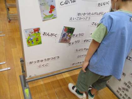 朝の会で,今日の予定を自分で掲示していきます。