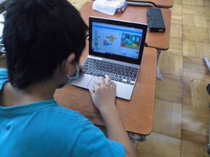 休み時間にはタブレットをさわってスクラッチに取り組む子がいます。自分たちで効果を考え,いろいろなおもしろさを追加しています。