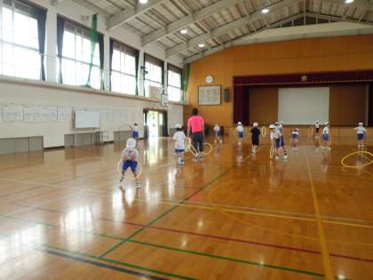 今日は,体育館で用具遊びの学習をしました。上手にフラフープを使っていました。