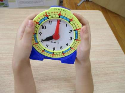 言われた時刻に時計を合わせたり,示された時刻を読んだりしています。