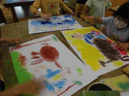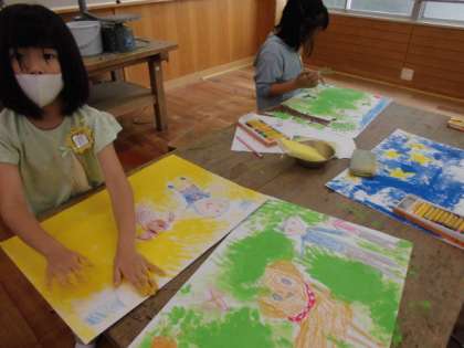 お話を聞いて,好きな場面を絵に表しました。クレパスでていねいに色を塗ったり,表情豊かに登場人物を描いたり,絵具で背景を作ったり,楽しみながら絵に表していました。