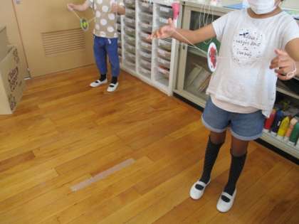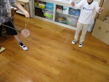 ブンブンゴマが完成したので,みんなで回してみました。