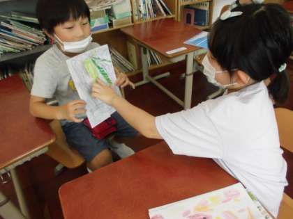 「うみのかくれんぼ」では,単元のまとめとして,「かくれんぼカード」を作りました。色々なかくれんぼ名人の生き物を調べ,体の特徴やかくれ方などをまとめました。友達との交流も,クイズを出し合って盛り上がっていました。
