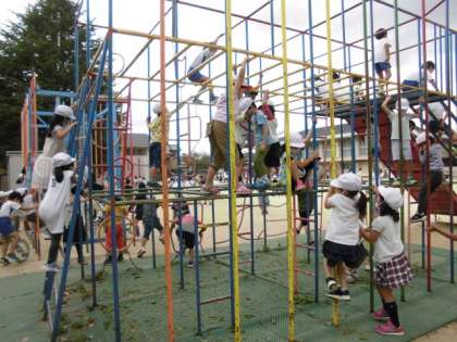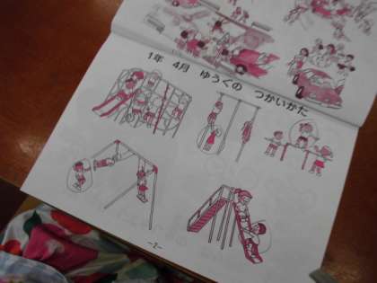 体育で遊具の学習をしたので,休み時間も遊具を使えるようになりました。総合遊具は,1年生に大人気です。危険な遊び方をしないように,安全ノートでも確認しました。