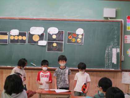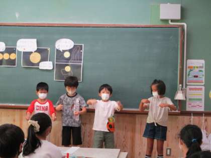 まず,1組のみんなでブンブンゴマの作り方を説明しました。