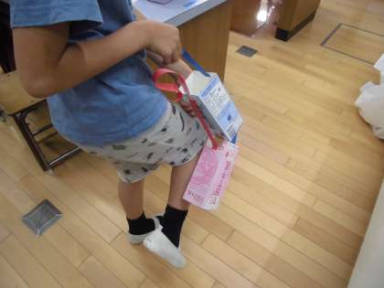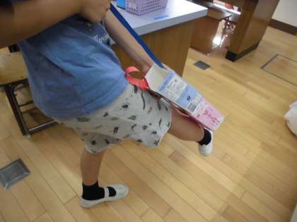 牛乳パックで作った模型は,うでの筋肉を想定していたのですが,「足のキックのときの動きも同じだ!」ということを発見した子どもがいました!