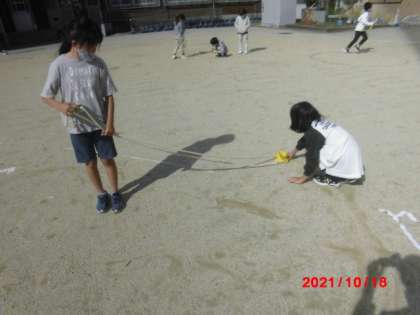 「運動場ではコンパスは使えないし・・・。」と言って子どもたちが選んだ道具は大繩です。