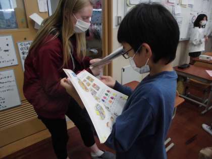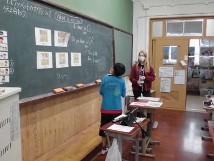 など,ならった小文字をたずねあい,自分が決めていた言葉を当てるというクイズを通して友達やALTとやりとりを行いました。
