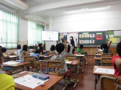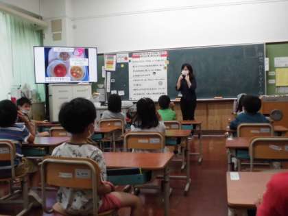 栄養教諭の梅原先生が来られて,味わい方について教えていただきました。味わう方法は,口だけでなく,目や鼻や耳(音)などでも味わえることを知り,「今日の給食は鼻を使って味わってみよう。」と,給食をいつも以上に楽しみにしている様子でした。
