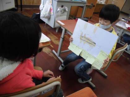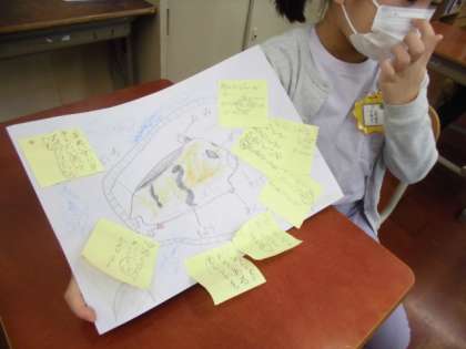ハムスターのハムくんを紹介する文章と絵ができました。友達に絵を見せながら,紹介し合いました。「ハムくんの様子がよく分かりました。」「私も,しっぽのことを書きました。」「私も,ハムくんが回転車を回しているところを見てみたいです。」などと,コメントをしていました。