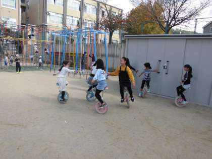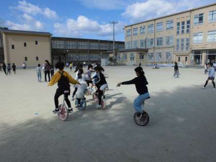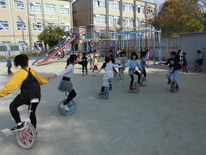 今日,運動場では,たくさんの子が一輪車に乗っていました。