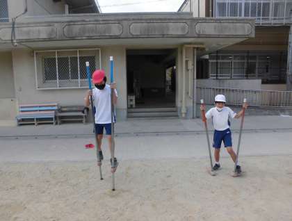 前回使用した,ボール,体操棒,フラフープに加え,竹馬と一輪車にもチャレンジしました。