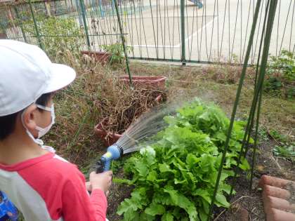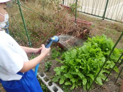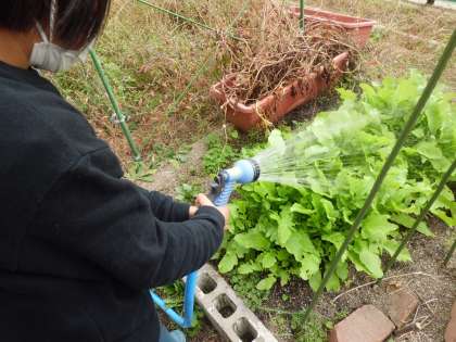 1組の畑で育てている大根と人参がだいぶ生長してきました。立派な大根葉に期待がふくらみます。