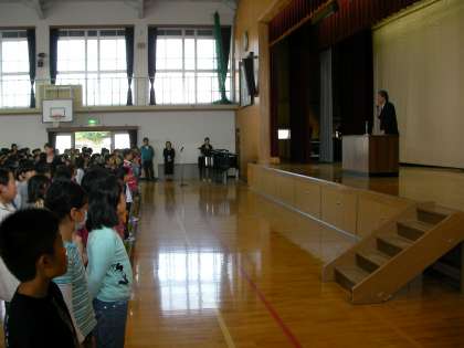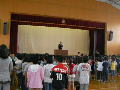 式では,前期をふりかえり,4月に立てた目標がどれだけ達成できましたか。まだまだ達成できていないことがあっても,努力を続けましょう。「努力は裏切らない」です。必ずやりとげましょう。また児童会の人が中心となってやってくれている「あいさつ運動」への感謝と,さらなるあいさつ運動向上に向けて,「あいさつは笑顔を添えて私から」とみなさんに呼びかけました。