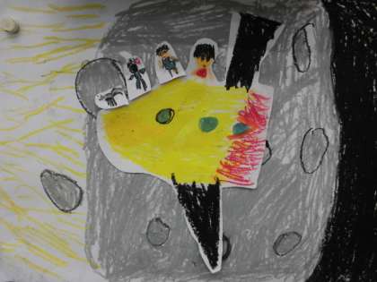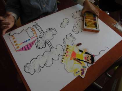 乗り物や動物に乗っている自分を切り取って,画用紙の上で動かして,どこに行きたいか考えました。みんな,すてきな世界を,心をこめて描いていました。