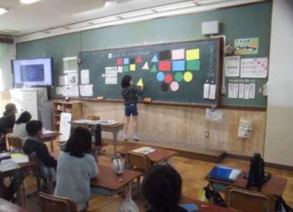 写真は,いくつかの形を組み合わせて「これは何?」」クイズをしている様子です。
