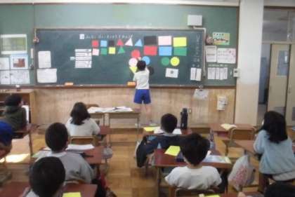 □はsquare,長方形はrectangle。これらの英語は子どもたちには聞きなじみがなく,発音にも苦戦していました。