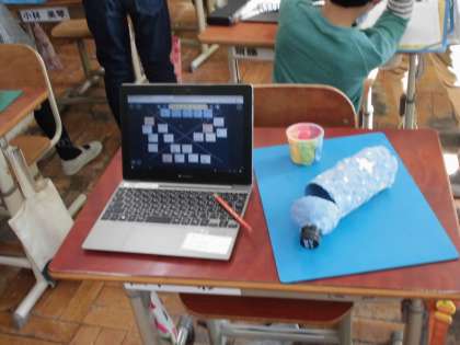 作品とその横に端末を置いて,端末には,作品で工夫したことを書きました。
