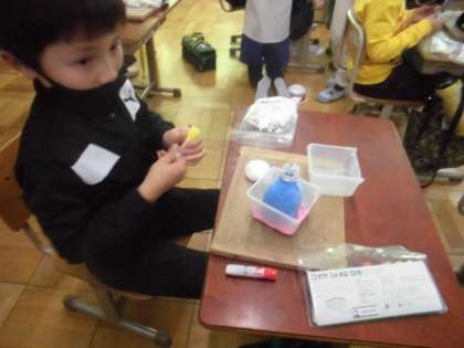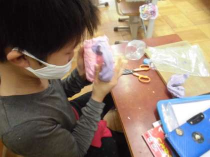 図工では,空き容器に粘土をくっつけて小物入れを作っています。