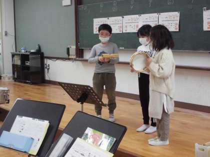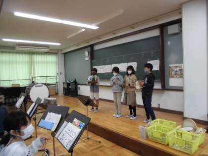 今日は,これまで話し合って決めた楽器を使って,音楽づくりの練習・発表会をしました。
