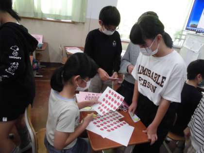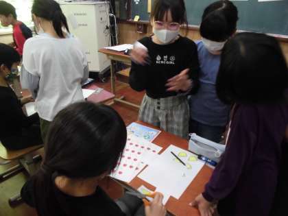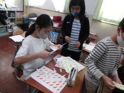 今日は,クラスの半分がお店屋さんになり,半分がお客さんになって,パフェにいれたい果物やアイスクリームをあげたり,もらったりするという活動をしました。