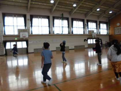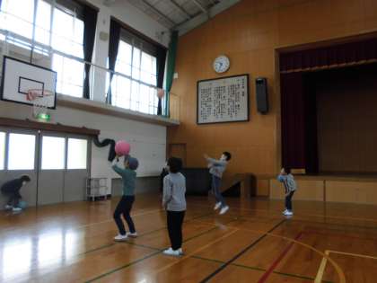 ボールをバスケットボールのリングにシュートしたり,2人でキャッチボールしたりしている子もいれば,