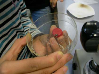 まず,火山灰についているものを洗い流し,鉱物だけを取り出します。