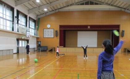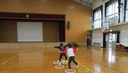 体育館で,ケンステップを使ってケンパをしたり,ドッチビーで遊んだりしました。