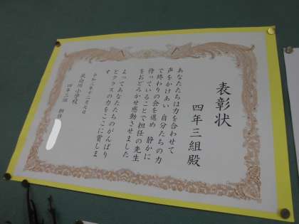 みんなの力でみんなでやってくれたことがうれしくて,今日3組のみんなに賞状をおくりました。