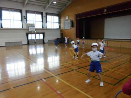 「ようぐあそび」では,フラフープや棒を使って,遊びを工夫しました。いろんな遊びを考えて,友達と楽しんでいました。