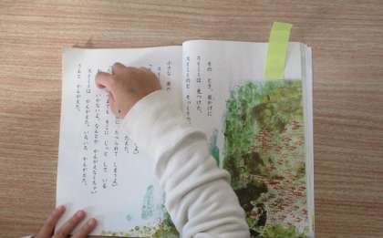 読んでいるところを押さえながら,丁寧に読んでいます。
