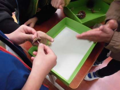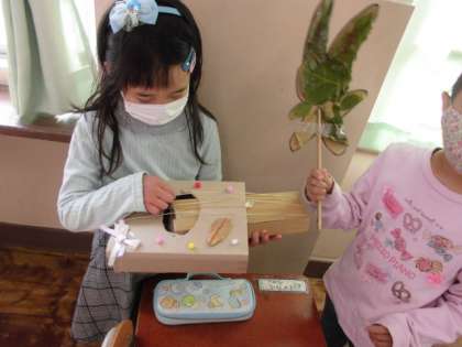 「あきといっしょに」では,遠足で拾ってきた秋のものを使って,おもちゃなどの友達と楽しめるものを作りました。どんぐりの帽子やどんぐりを使ったこまで,バトルを楽しむ姿や,楽器を作って一緒に奏でる姿が見られました。