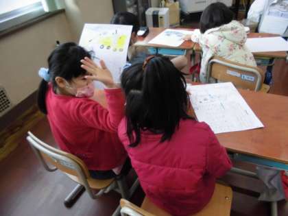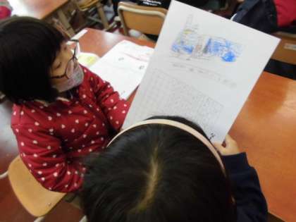 「じどう車くらべ」では,面白いと思う自動車を調べ,紙にまとめました。自分が調べた車の「しごと」と「つくり」について,友達に発表していました。