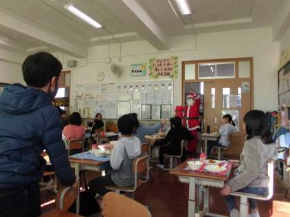 そして,4年生にもサンタさんがやってきて,チョコレートケーキをプレゼントしてもらえました。