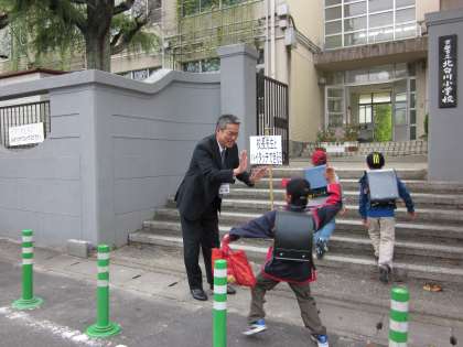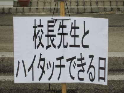 後期始業式で,子どもたちに話しかけた毎週月曜日は「校長先生とハイタッチ