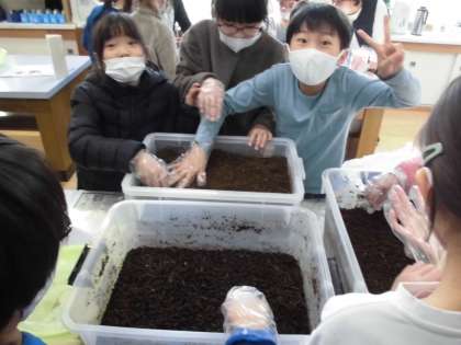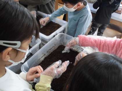 実験の合間に,カブトムシの幼虫が入っているケースの中も観察しました。