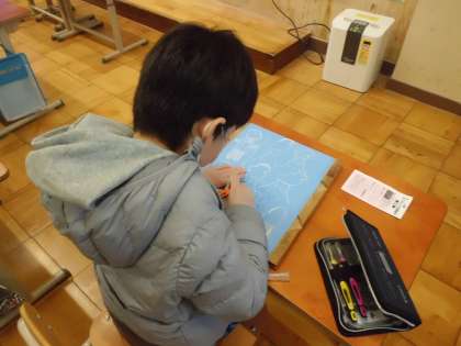 今日は,図画工作の版画で線彫りをしました。版画作業板を下にひいて,安全に気を付けて彫りました。