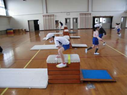 横と縦の開きゃくとびに加え,横かかえこみとびや台上前転に挑戦する子も出てきました。