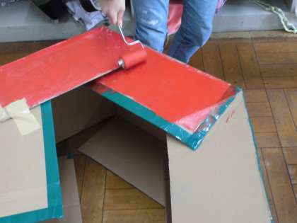 「ここは屋根になるから赤にしよう。」