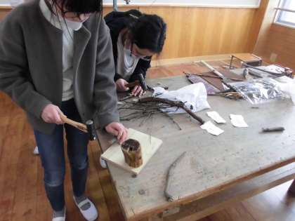 図工では,木の枝や板を使って「ひみつのすみか」を作る活動に入りました。